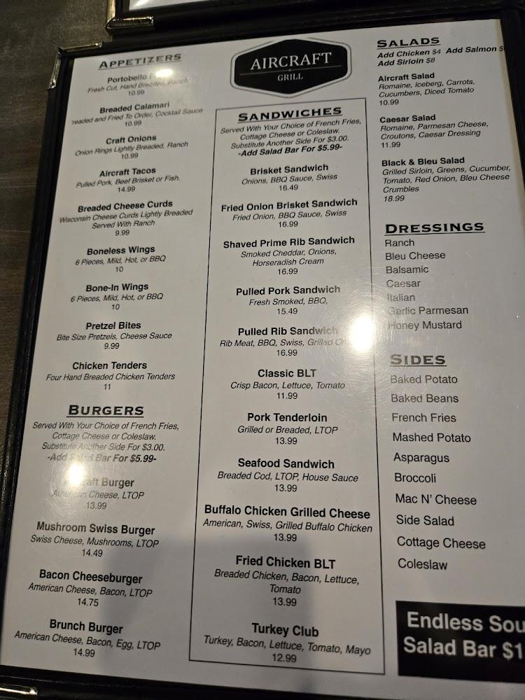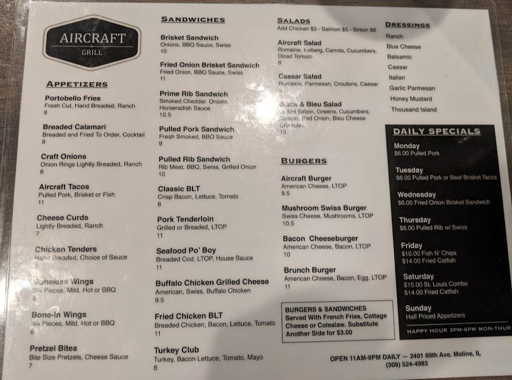 Welcome to Aircraft Grill, your go-to dining destination in Moline, IL. Situated at 2401 69th Ave, we pride ourselves on delivering a relaxed atmosphere complemented by excellent service. Enjoy a delectable range of traditional cuisine, refreshing cocktails, and an impressive selection of local beers—all perfect for lunch, dinner, or a solo meal. Our family-friendly amenities include accessible seating and a kids' menu. With options for dine-in, takeout, and delivery, experience culinary delights amidst a charming setting. Join us for brunch, and don’t forget to save room for our exquisite desserts! Reservations are welcome.